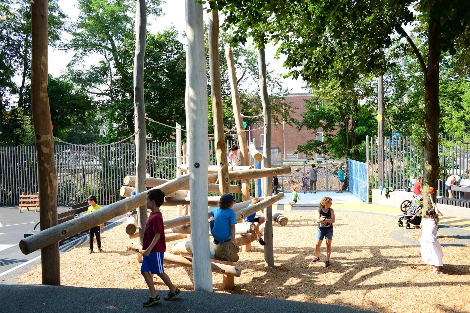 In 2015, Hoyt Sullivan was identified by the City to receive extensive renovations. Working with the City, community, and a modest budget, we delivered a concept that reimagines adventure play in a modern way. The project successfully preserves much of the tree canopy, including a majestic beech that anchors the site while offering a completely transformed space. The design recaptures the slope that was flattened in the existing conditions, helping to better align the park to the neighborhood’s drumlin and maximizing play and adventure opportunities for a small site. A fully-accessible adventure path weaves through the park and accentuates the topography while simultaneously connecting program elements and distinguishing the mandatory age-appropriate clustering for play equipment. The plan also seizes on the site’s proximity to the MBTA Fitchburg Line by replacing a steel fence section with a cantilevering overlook which formalizes the experience for children watching MBTA trains.