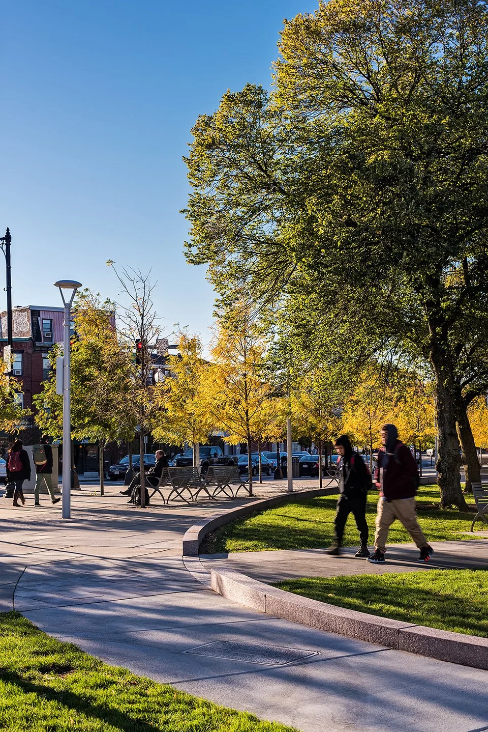 The public space was substantially expanded by reducing lane widths and simplifying vehicular circulation (pictured right). The original ellipse was reinterpreted as a low granite seat wall supporting impromptu informal play and gathering. The historic urban tree canopy was restored and supplemented with 97 new trees to help address urban heat island issues (East Boston is the neighborhood with the least tree cover in the city). The Central Square project became a Boston Water and Sewer pilot site to test green infrastructure and stormwater infiltration, including directly feeding planted areas. The site was designed to store 95,000 gallons of stormwater, minimizing the overflow to Boston Harbor. And perhaps most importantly, it is now a safe, vibrant, accessible neighborhood place with yearlong activity.