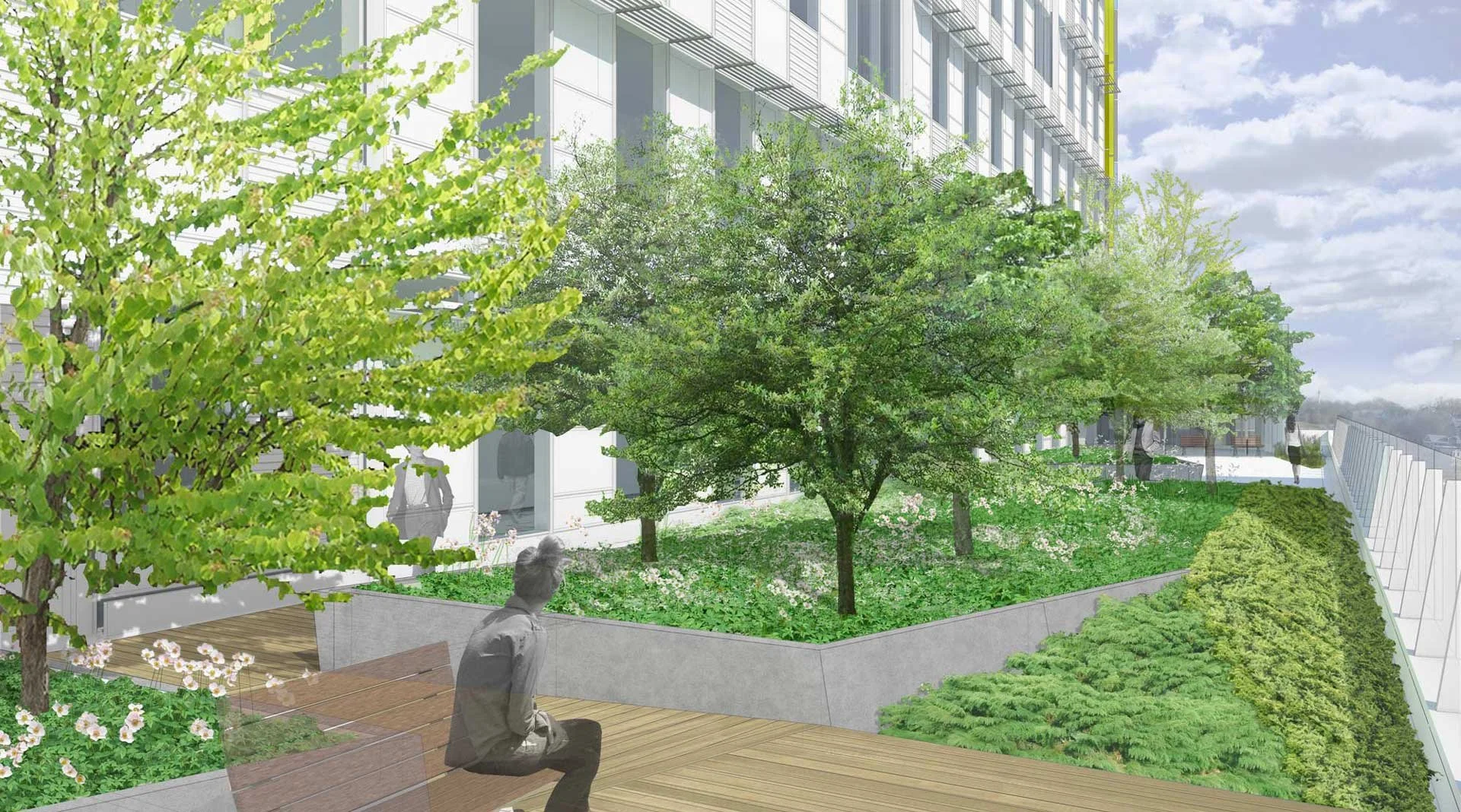Phased projects include rooftop and on-structure landscapes of a new clinical and research tower, streetscape and hospital entrance zones, retrofitting existing roofs with landscapes, and creation of healing and patient gardens. Interior projects include atrium landscapes, introduction of new ‘terrarium’ landscapes in lobbies, and seating spaces along the central ‘pike’ that unites the campus across its entire length.