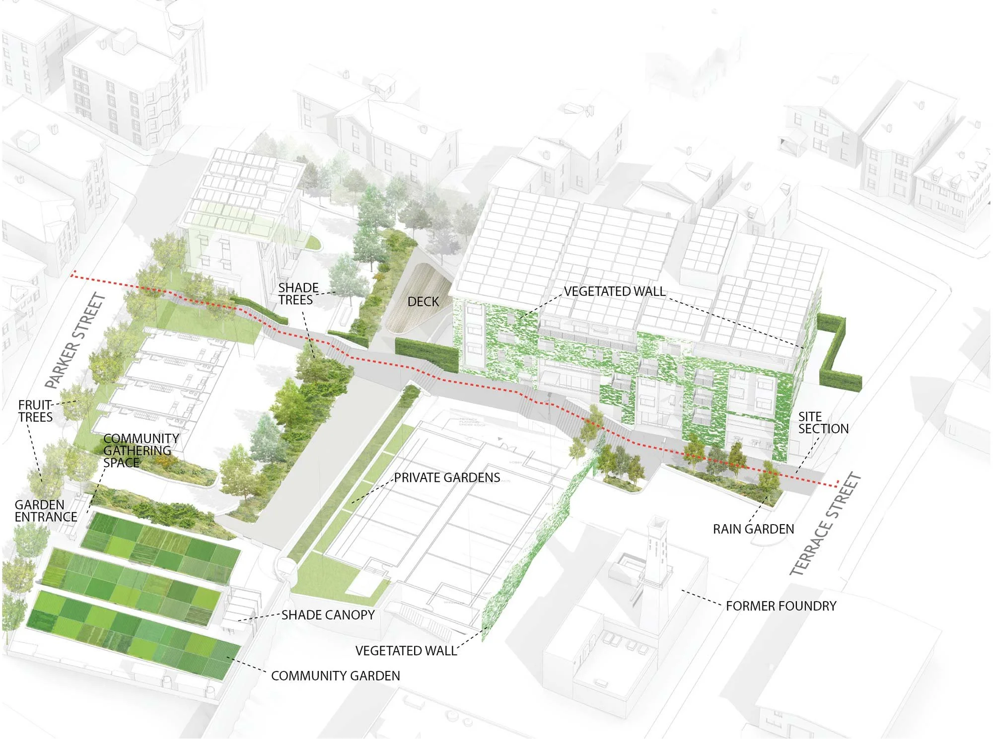 The proposed site design is organized around three primary green spaces and corridors. Each building connects onto a stepped, landscape spine that creates a semi-public common for the development and links the upper and lower streets. A multifunctional community and art garden connects to Parker Street and the core of the project through a ramped connection. Green walls further extend the landscape’s presence on the tight parcel and act as summer cooling devices for the building envelope. The proposed landscape also serves a vital part of a comprehensive stormwater management system which was designed to collect, convey and capture water across the entire site for gray water uses and irrigation.