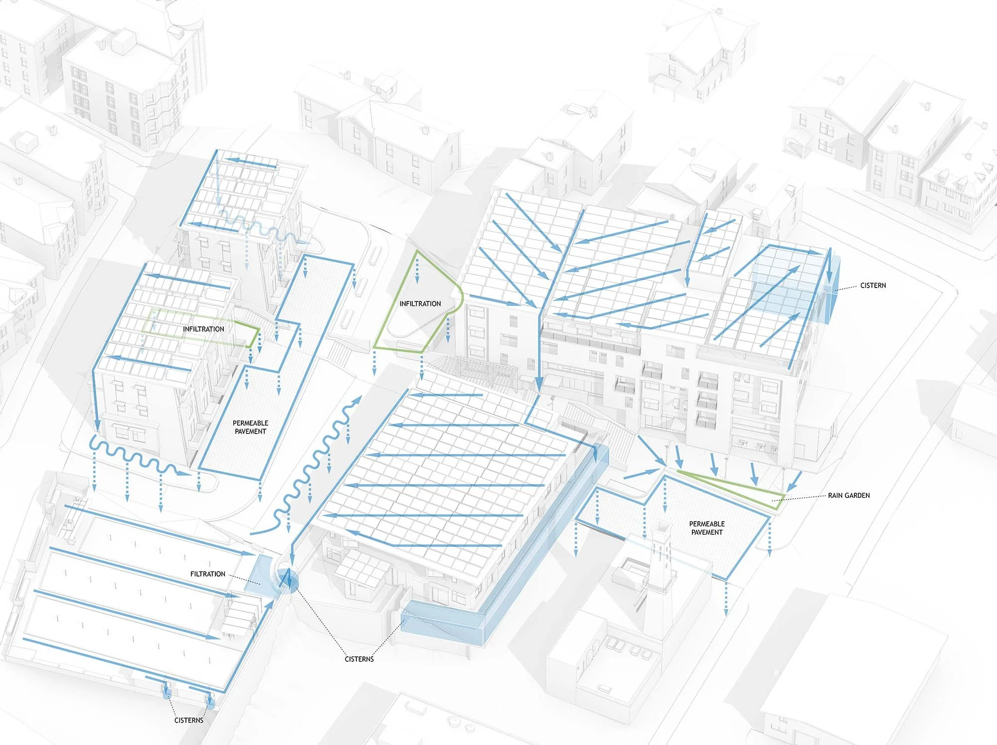 The E+ Green Communities Program is a pilot initiative of the City of Boston that seeks to advance Boston’s green building and renewable energy efforts by creating deep green, energy positive, healthy and sustainable communities. In 2013, the program issued an RFP to envision the next generation of sustainable neighborhoods and green buildings on two city-owned parcels in Mission Hill. Klopfer Martin Design Group worked in tandem with a large multi-disciplinary team to develop a proposal where landscape is central to the social, ecological and economic health of the proposed community.