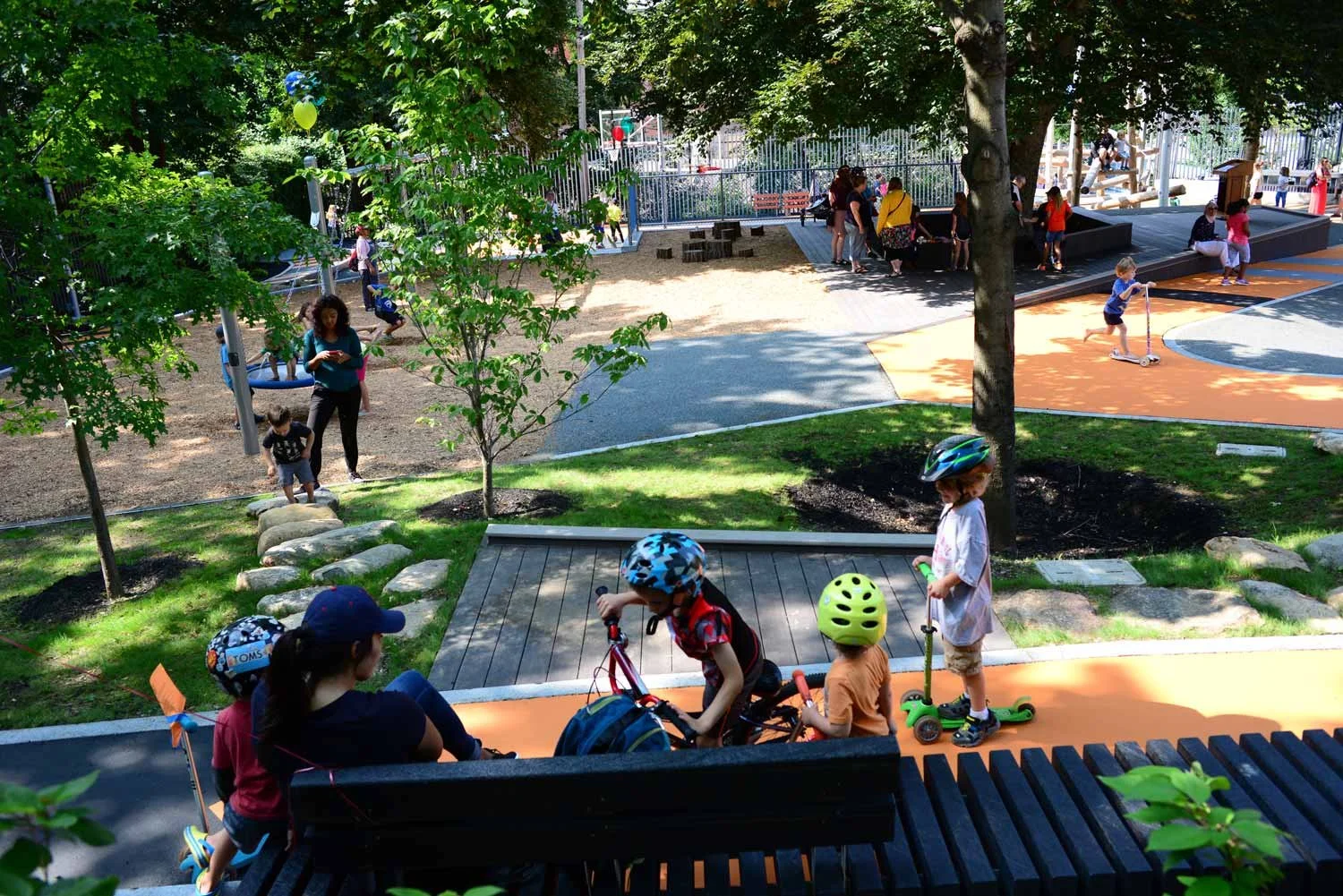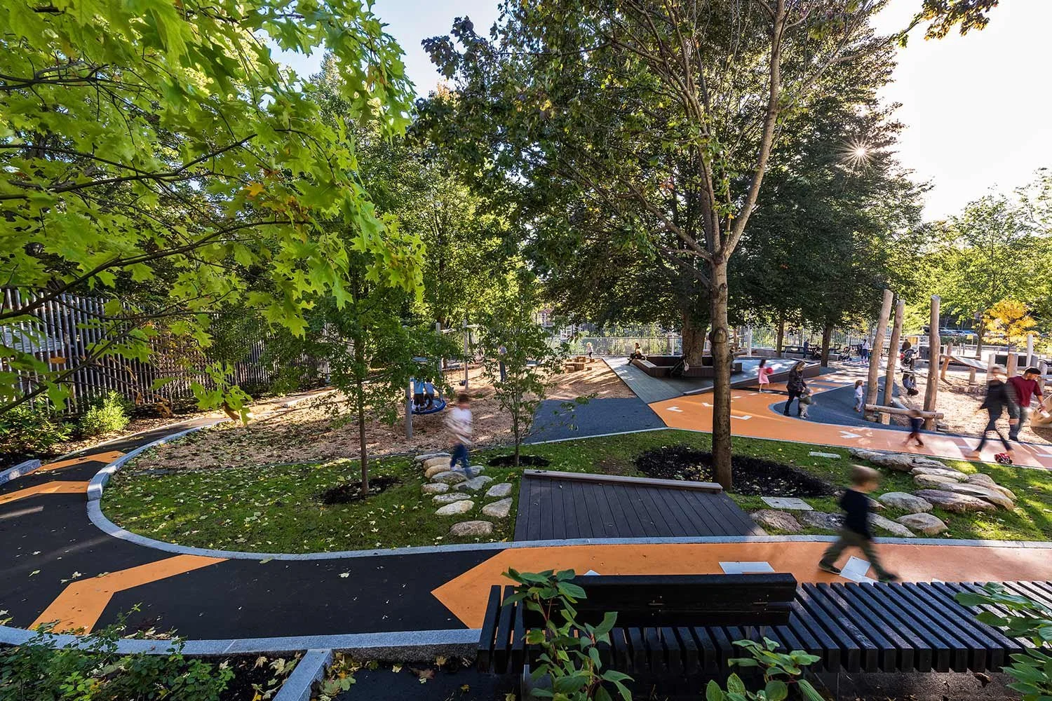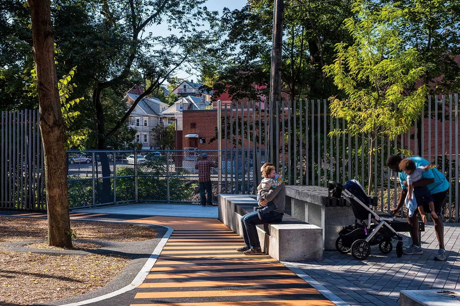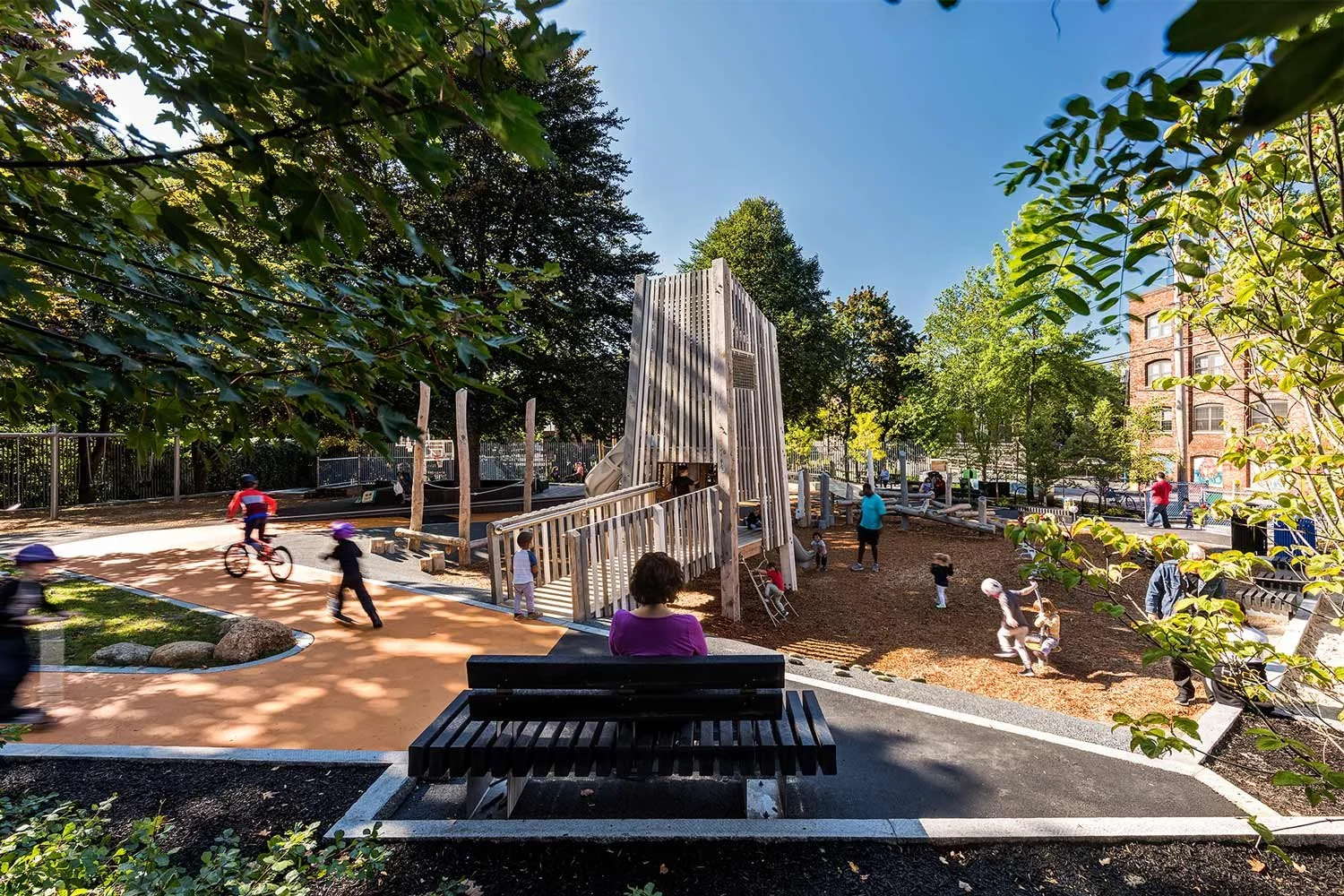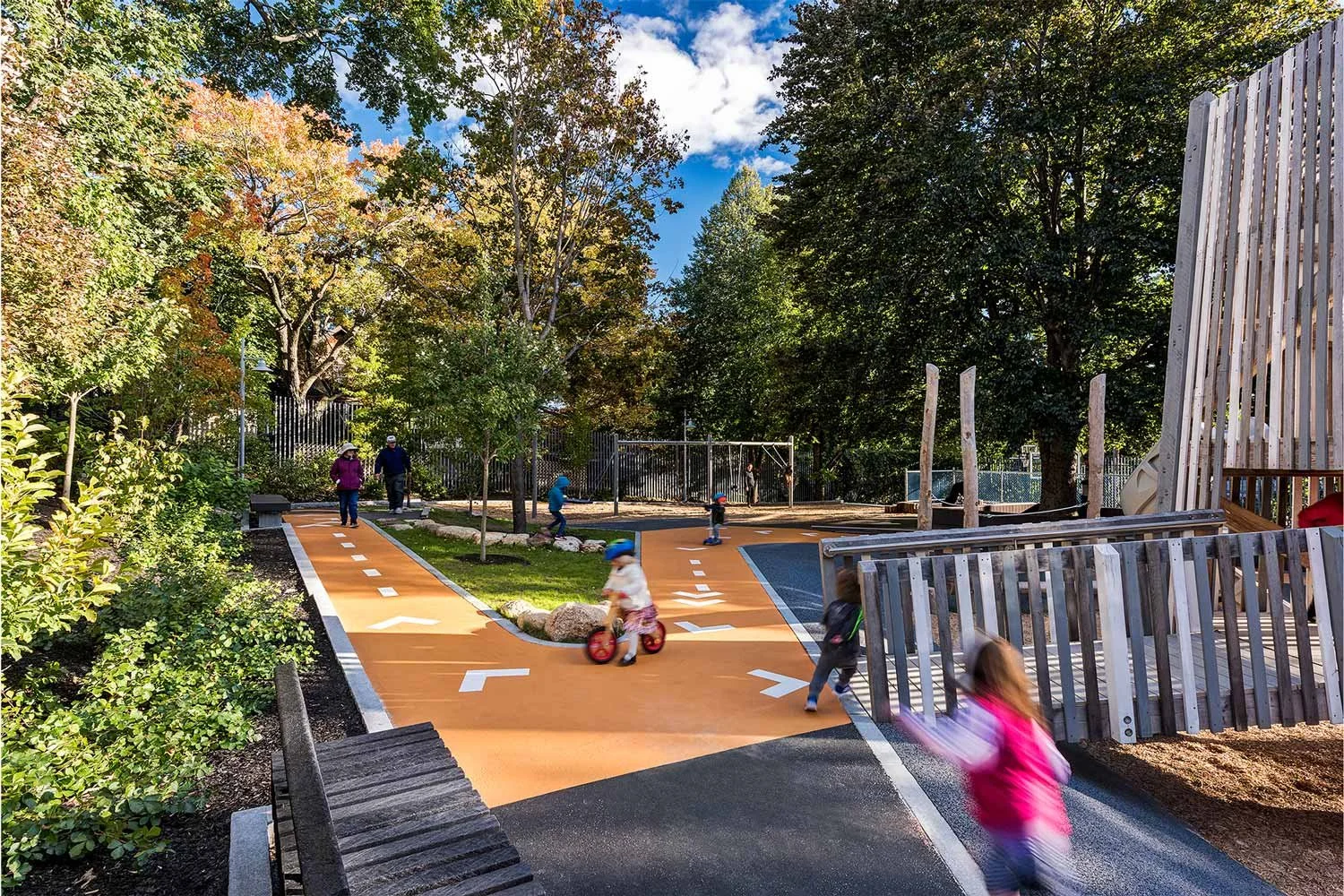 The new design creates several outdoor play rooms that are intended to provide diverse experiences for children and adults of varying ages and abilities. Overlooking the MBTA Lowell line, KMDG seized the opportunity to safely watch passing trains from an overlook platform that cantilevers over an existing wall and slope. Large areas for pre-schoolers and school-aged children are shaded by an existing beech tree and feature age-appropriate climbers and slides. A scootering path moves up and down subtle topography, creating a circuit that intersects with all areas of the park while also providing accessible entrances to those areas as well. A sand and water play area allows younger children the chance to interact and play with natural elements. At the entry of the park, a small plaza area just off the street was designed as a welcoming gateway, with a community table and benches creating an informal picnic and gathering space.