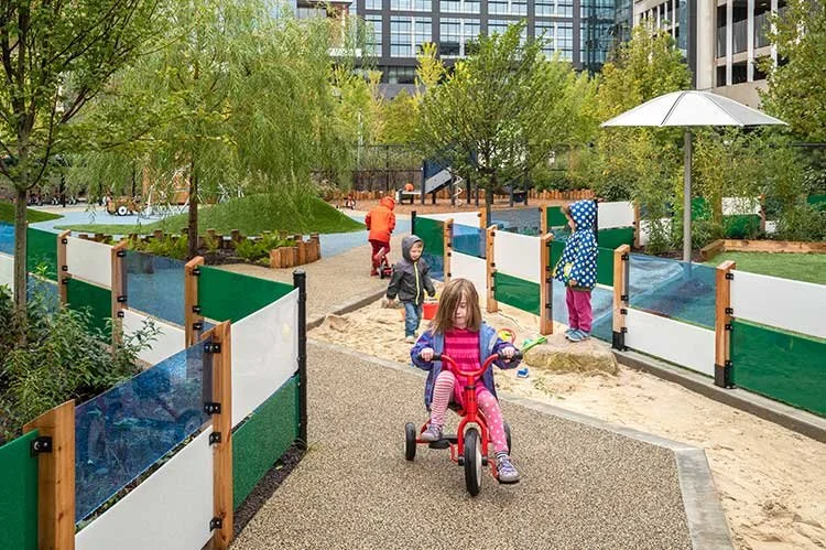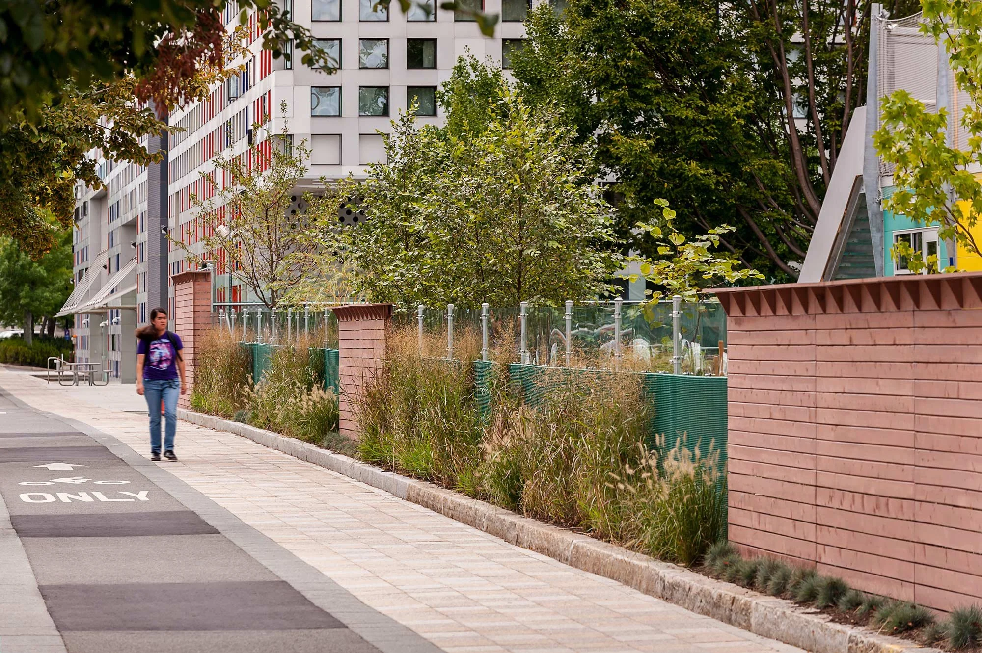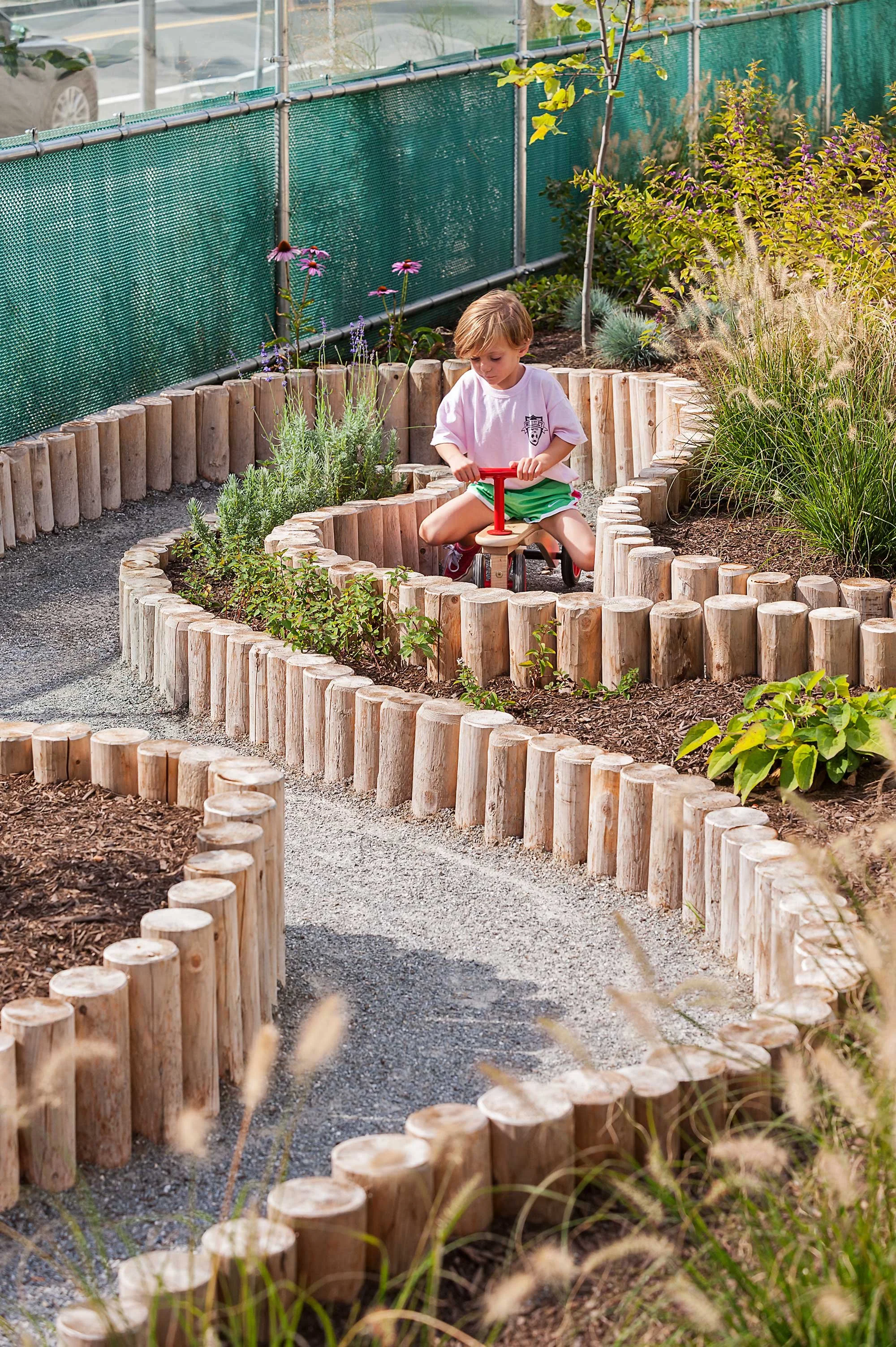 Located on well-traveled Vassar Street, the play spaces offer intrigue, texture, color and challenge at all times of year in spaces that strike a balance between being programmed and open and loose to allow children to explore their world on their own. Highlights include child-scaled landforms for climbing up and over, a bamboo ‘forest’, a garden maze, decks for unprogrammed imaginary play, and textural and multi-seasonal plantings.